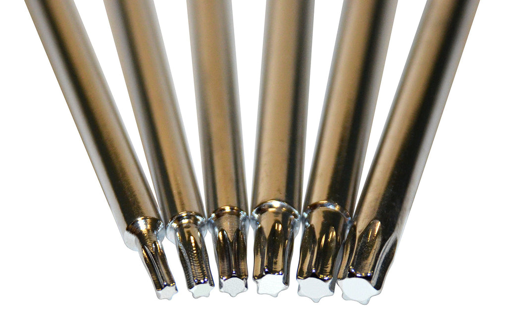 Eje largo para zonas de difícil acceso | Hecho de acero S-2 para mayor resistencia | 15-3/4 pulgadas de largo | También disponible en versión a prueba de manipulaciones (No917) | El juego incluye: T-10, T-15, T-20, T-25, T-27 y T-30. El juego de destornilladores Torx extralargos Cal-Van Tools tiene un eje largo para áreas de difícil acceso. Está hecho de acero S-2 para mayor resistencia. Tiene una longitud de 15-3/4 pulgadas. También está disponible en versión a prueba de manipulaciones (n° 917). El conjunto incluye: T-10, T-15, T-20, T-25, T-27 y T-30.