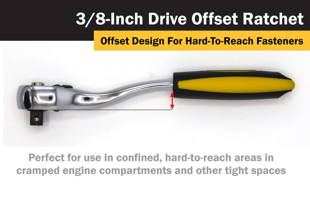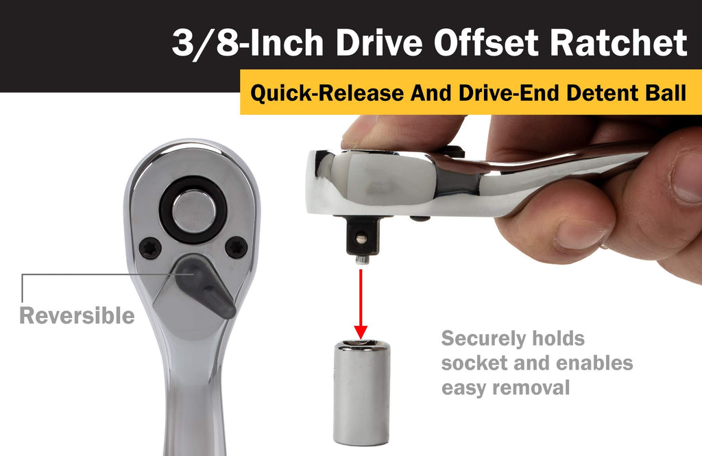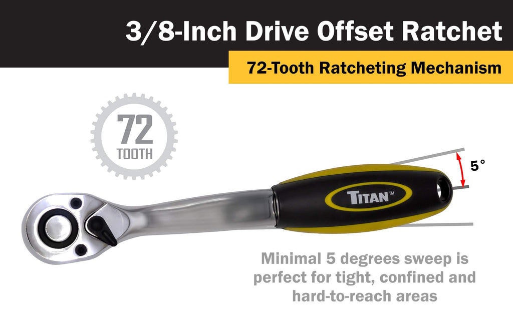 La función de liberación rápida sujeta los enchufes cuando se necesitan y se suelta cuando no se necesitan | Mango con agarre acolchado contorneado | Diseño desplazado para sujetadores de difícil acceso | El trinquete con desplazamiento de accionamiento ProfessionalTitan de 3/8 de pulgada tiene un accionamiento de 3/8 de pulgada con una función de liberación rápida. Mantiene los enchufes cuando son necesarios y se va cuando no lo son. Tiene un mango contorneado y acolchado. Tiene un diseño desplazado para sujetadores de difícil acceso. Tiene un mecanismo de trinquete de 72 dientes.