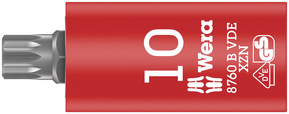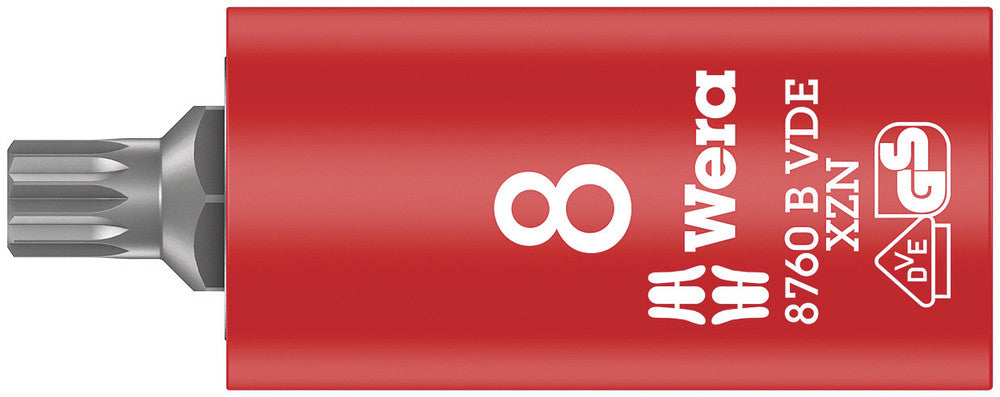 Introducing a high-performance insulated bit socket designed for multi-point socket screws, perfect for professionals seeking reliability and safety in their electrical work. This VDE certified tool features a unique yellow insulation core that enhances safety by becoming visible in the event of damage to the outer red insulation layer. Each bit socket is individually tested according to IEC 60900 standards at 10,000 V, ensuring safe operation at the approved voltage of 1,000 V.